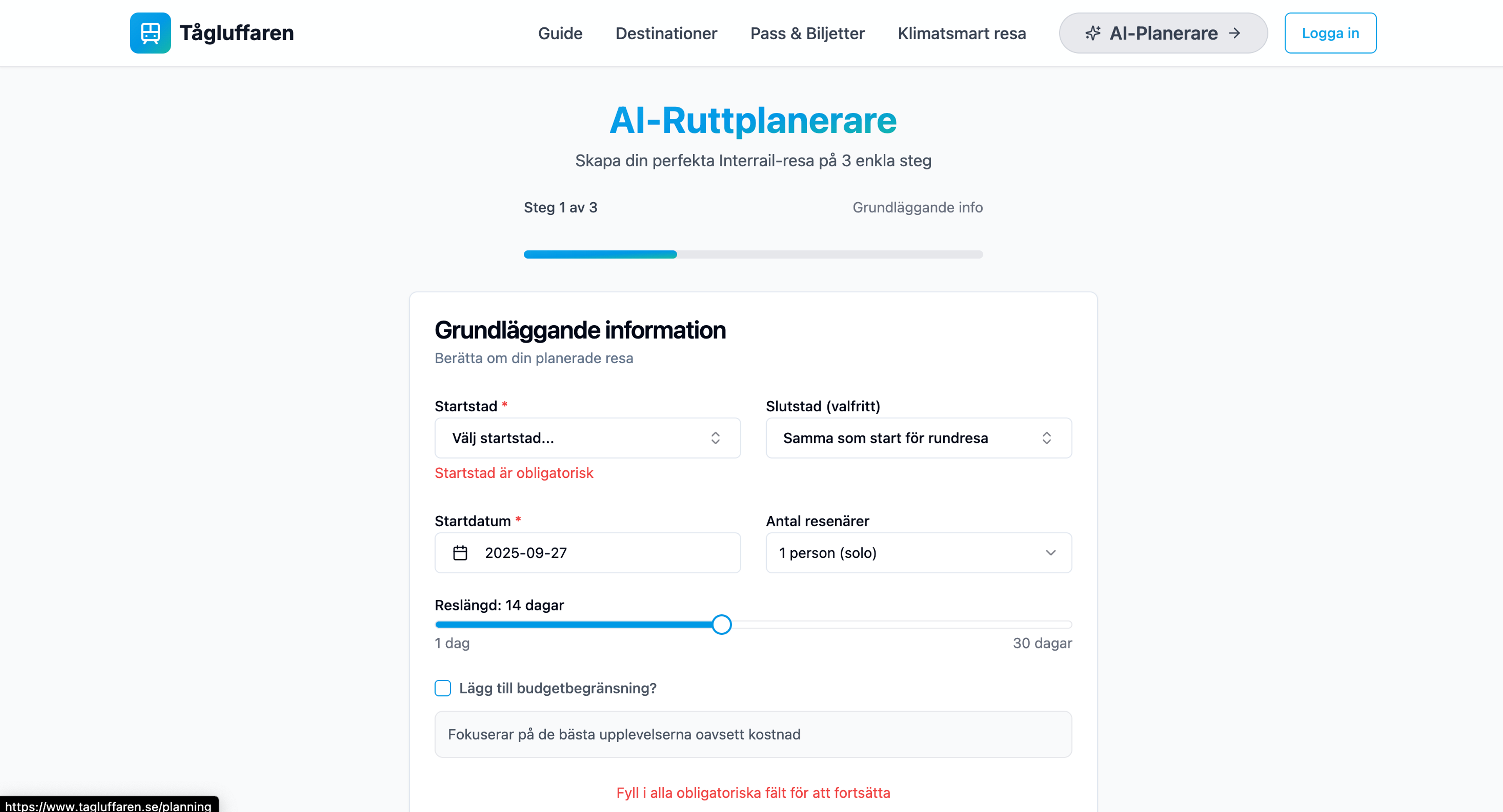 Att planera en tågluff kan ofta kännas överväldigande. Vilka städer ska man besöka? Hur bokar man biljetter? Vilka höjdpunkter får man absolut inte missa? Här kommer Tågluffaren in i bilden – en smart plattform som gör Interrail-resan enkel, snabb och rolig att planera.